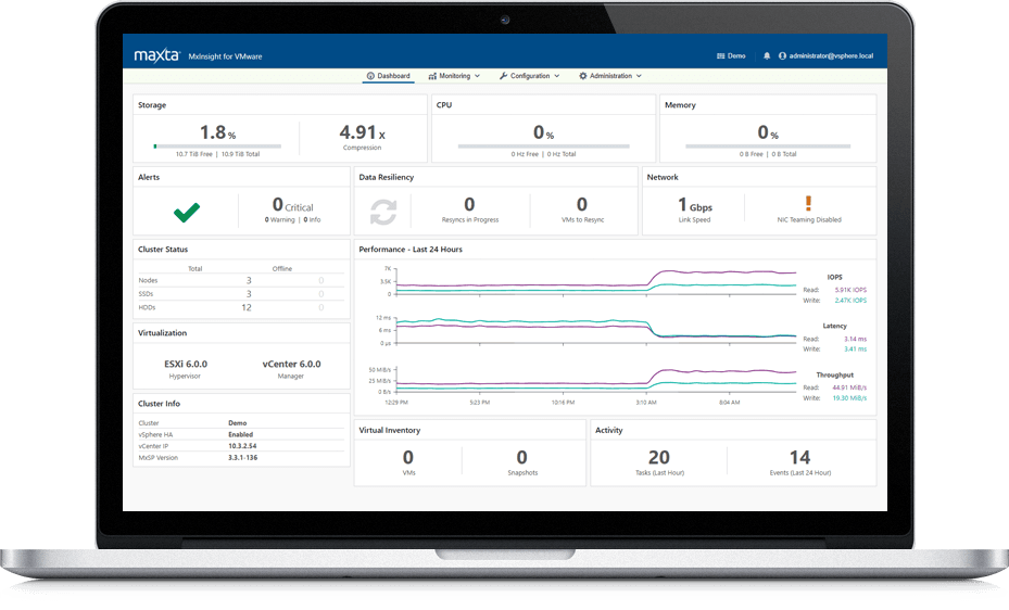 Maxta leverages flash storage resources as a read/write cache for performance (including PCIe, NVMe, or SATA SSDs for performance), and SATA or SAS HDDs or SSDs for capacity. The cache tier can also be deployed with multiple flash devices for redundancy.